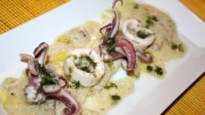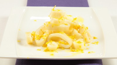 Scaldate molto bene una padella antiaderente e fatevi scottare le striscioline di calamaro.